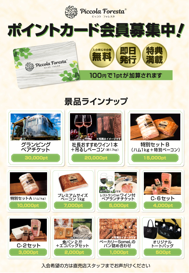 貯めたポイントは、特大サイズのハム・ベーコンをはじめ、 パンの詰め合わせやペアランチチケットなど、さまざまな景品と交換できます。