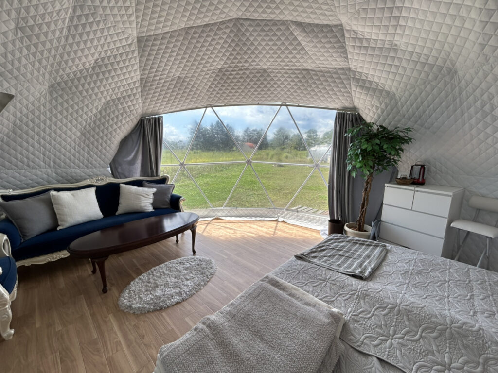 ドームテントはエアコン+ベッドを3台完備で快適に過ごせます♪