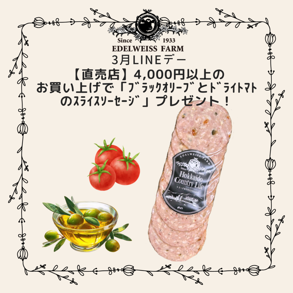 ※LINEデー特典について: レストラン・ベーカリー商品は、特典お買い上げ条件(4,000円)の対象外となります。1Fエーデルワイスファーム直売店のハム・ベーコン等の製品が対象です。