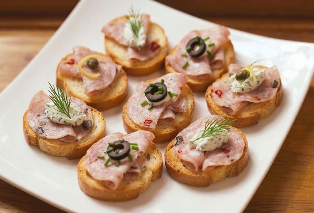 このソーセージは、肉の旨味にトマトの酸味とオリーブのコクが絶妙にマッチしています。したがって、そのまま並べるだけで立派なオードブルになりますが、1階ベーカリー「SomeL」の焼き立てバゲットにのせてカナッペ風にするのも非常におすすめです。